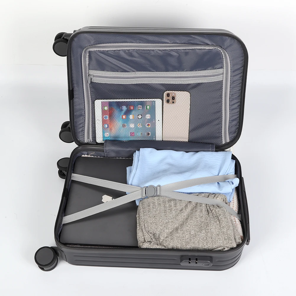 2. Organized Interior Design: The trolley case luggage set offers a well-organized interior with multiple pockets. Cross straps and dividers make packing easier, while various pockets keep your belongings neatly arranged. The large capacity luggage set includes a spacious toiletry bag for storing toiletries, cosmetics, small items, and personal belongings.