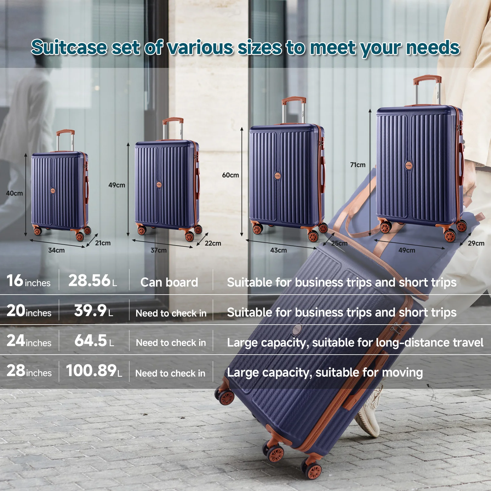 Luggage Set Introduction - The 6-piece set includes 4 suitcases of 16/20/24/28 inches, a handbag that can be expanded 10cm vertically, and a small cosmetic bag. The 20-inch suitcase size is approved by airlines for business trips.