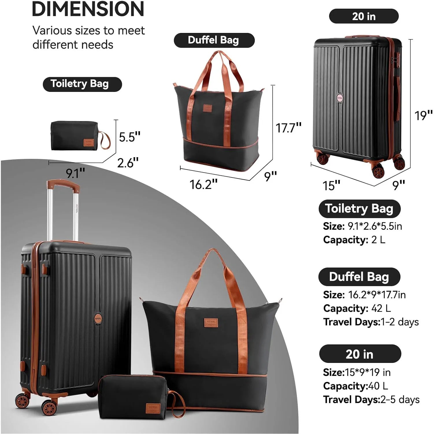 Luggage Set Introduction- The 3-piece set includes a 20-inch suitcase, a handbag that can be expanded 10cm vertically, and a small cosmetic bag. 20 inches is the size of the checked luggage approved by the airline for business trips.