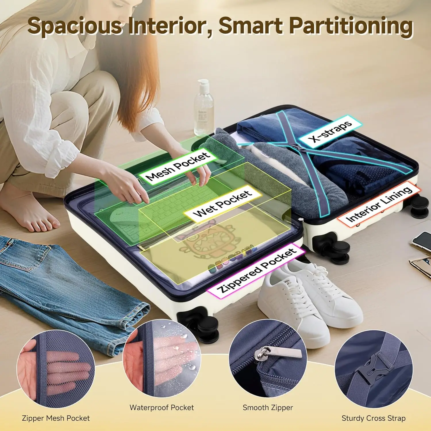[Super Smooth Double-Wheel Spinner Wheel]The spinner wheels on this luggage sets feature a double-wheel structure, with a total of 8 wheels to help the hardshell suitcases move smoothly over various complex roads, allowing you to move freely even in crowded areas. Compared to single-wheel, double-wheel spinner wheel move more quietly, smoothly, and stably, and less likely to tip over when pushing or pulling.