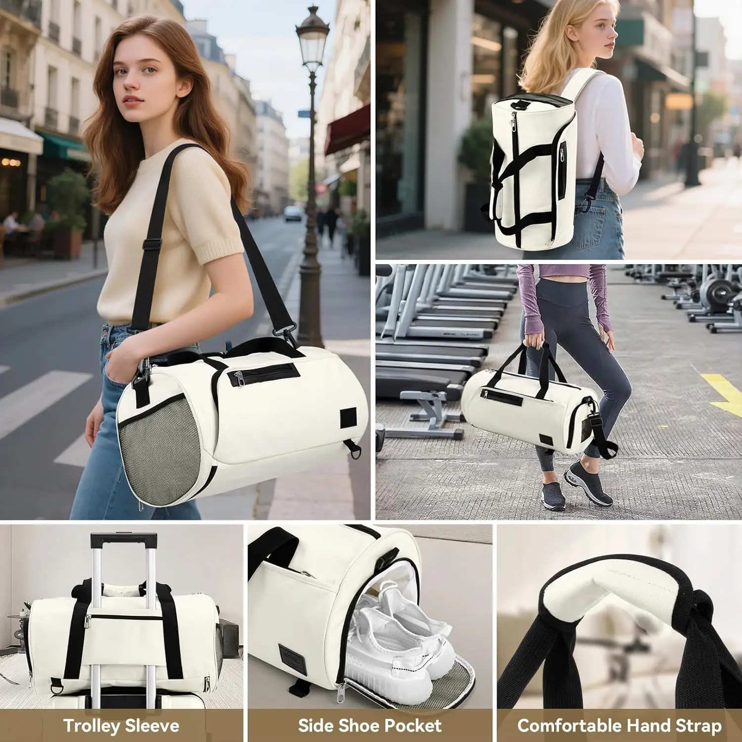[Multifunctional Fitness Bag]The multifunctional fitness bag has hidden double straps at the bottom and a long shoulder strap, providing you with multiple ways to use it, such as a handbag, crossbody bag, or backpack. The side of the gym bag is equipped with a shoe bag and a large ventilated mesh window, and the back features a back sleeve so you can conveniently attach it to the retractable luggage handle.