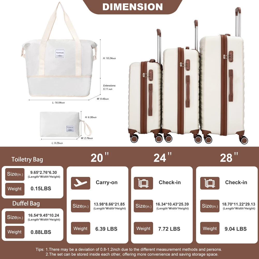 - 5 PIECE LUGGAGE SETS - The luggage set of 3 pieces offers 20" carry on luggage,24" medium checked luggage,28" large check-in suitcase, handbag, and storage bags, that can be nested together for easy storage.