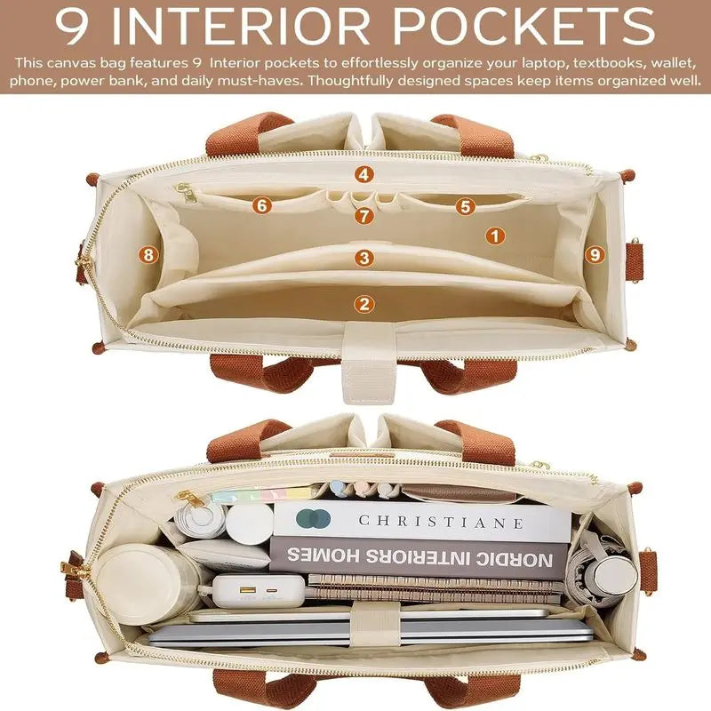 Canvas Tote Bag for Women, 15-Pocket Large Crossbody Handbag Bible Laptop Bag Zipper Bookbag for Teacher Work Travel College