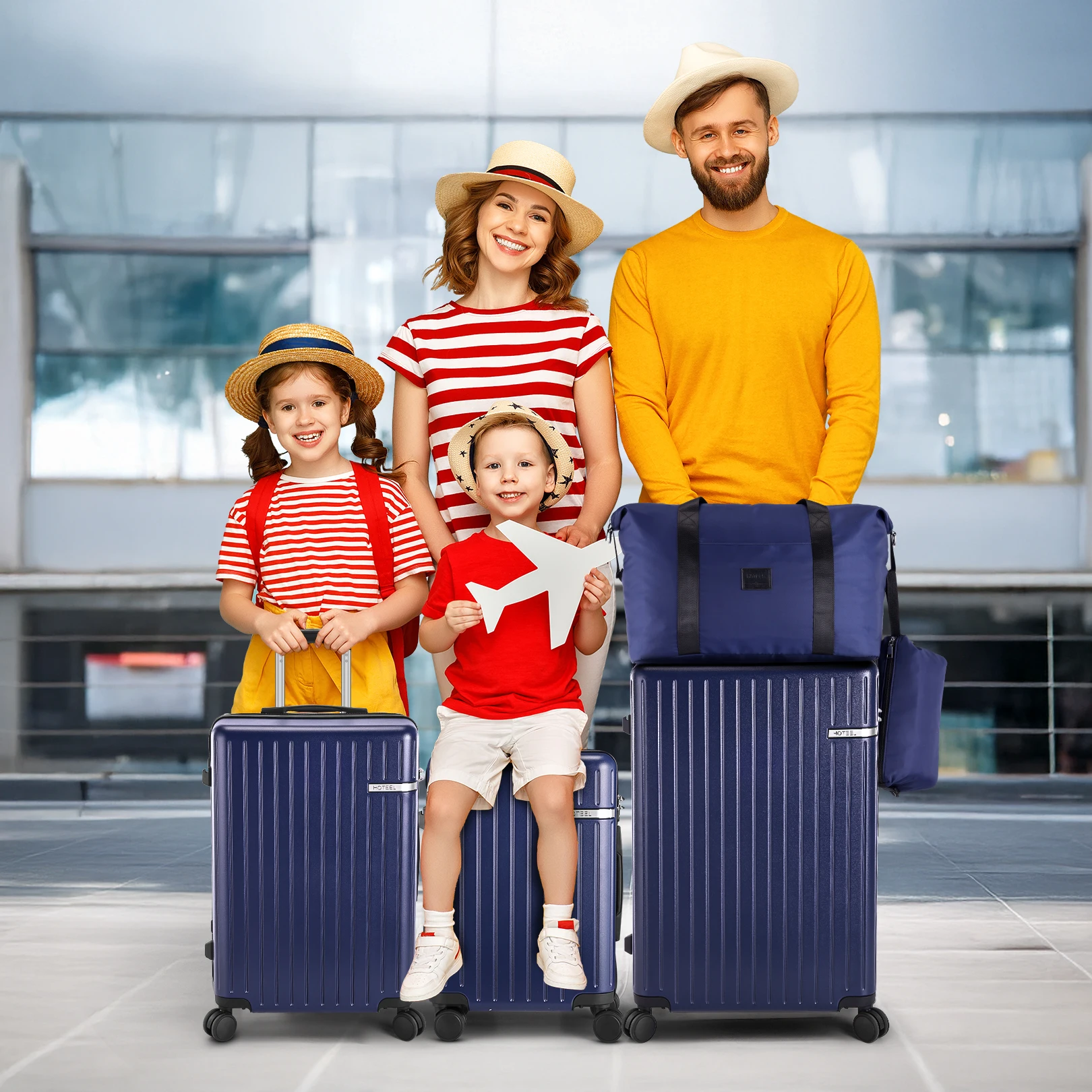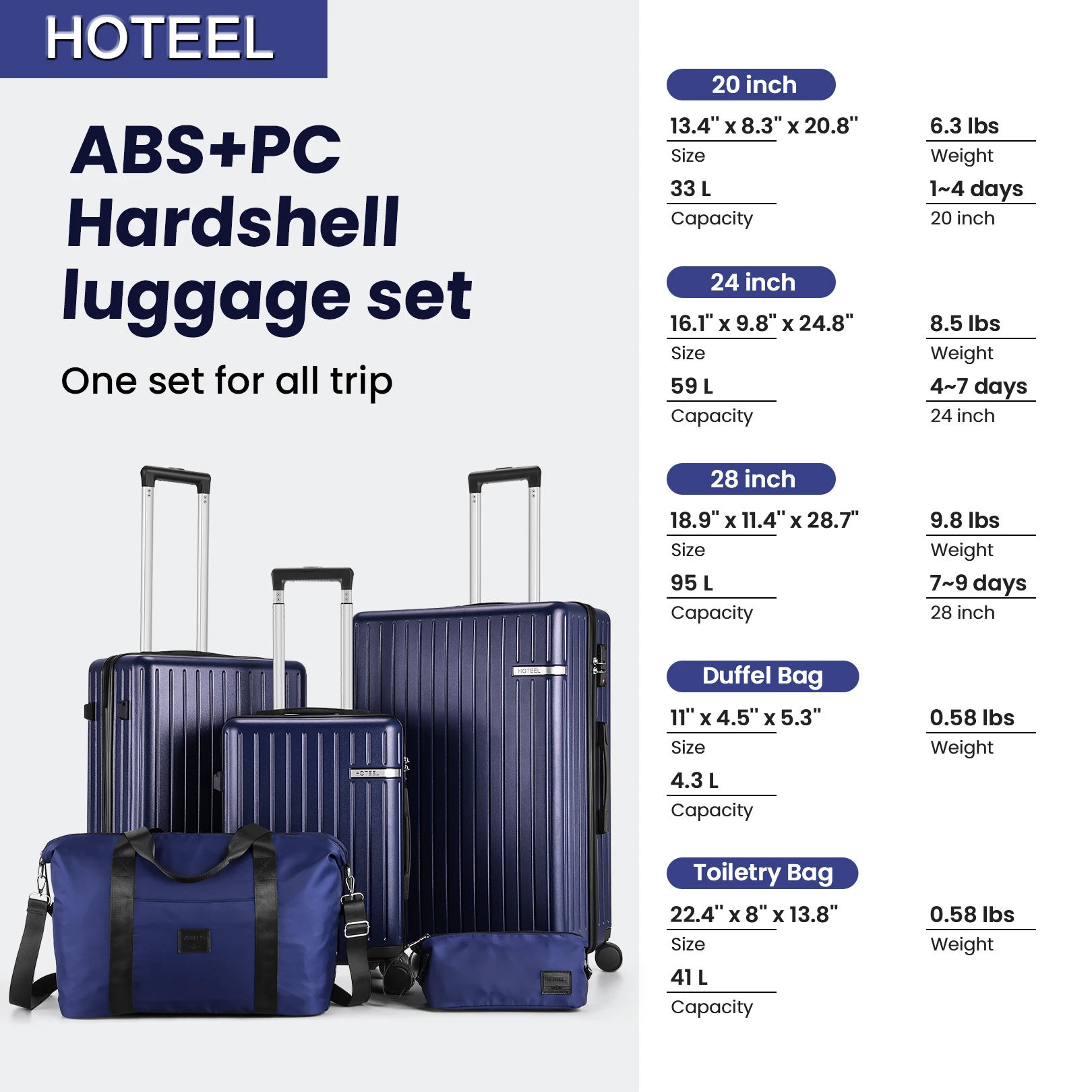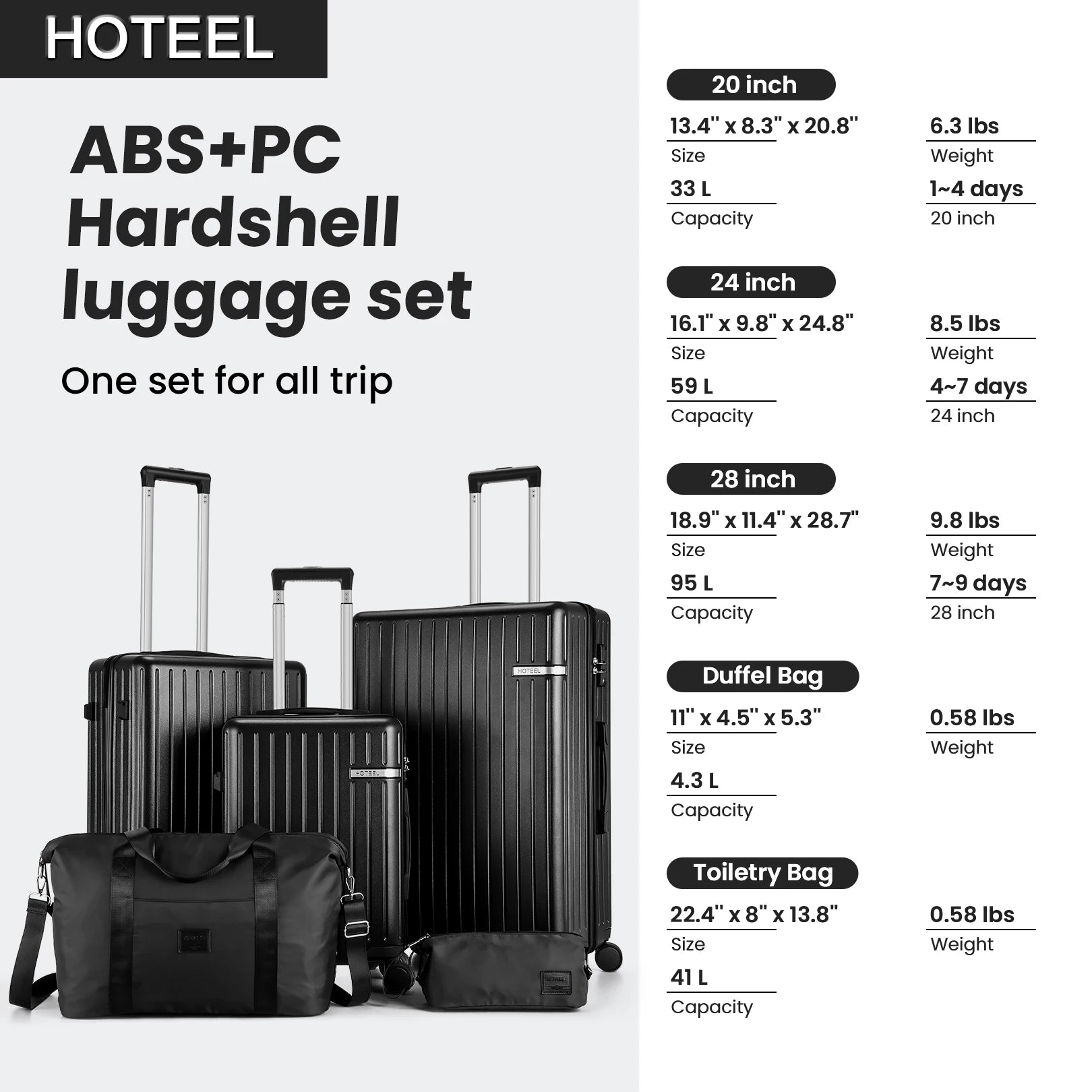 【Luggage Sets 5 Piece】This 5 piece luggage set includes a 20'' carry-on luggage (airline-approved), a 24'' luggage, a 28'' luggage, a duffel bag, and a toiletry bag, suitable for family trips, moving, long-distance business trips, and more.