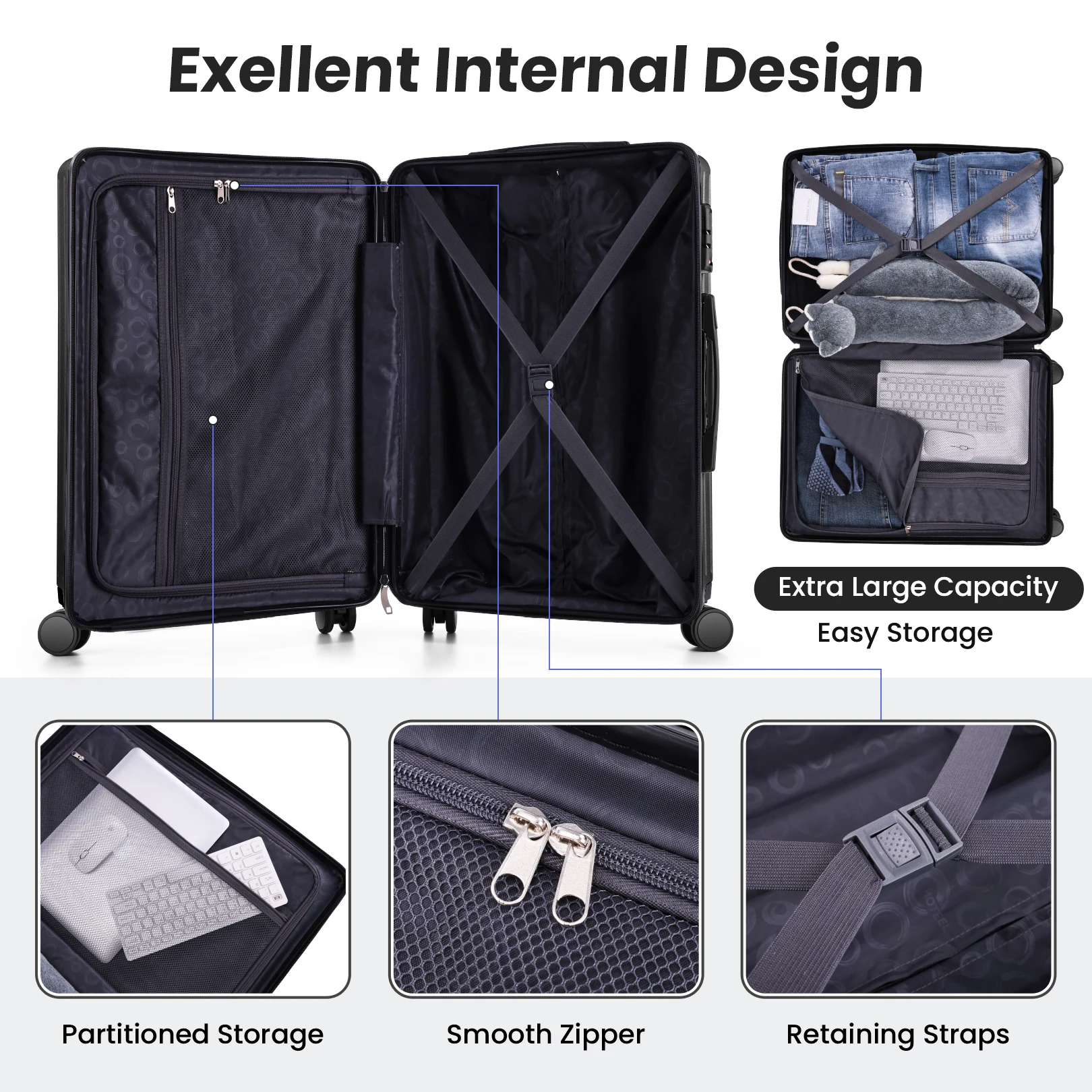 【Spacious Interior】The suitcases with wheels hardshell features multiple storage compartments inside, allowing you to organize your items neatly. The interior also includes a waterproof compartment where you can store items like perfume and skincare products.