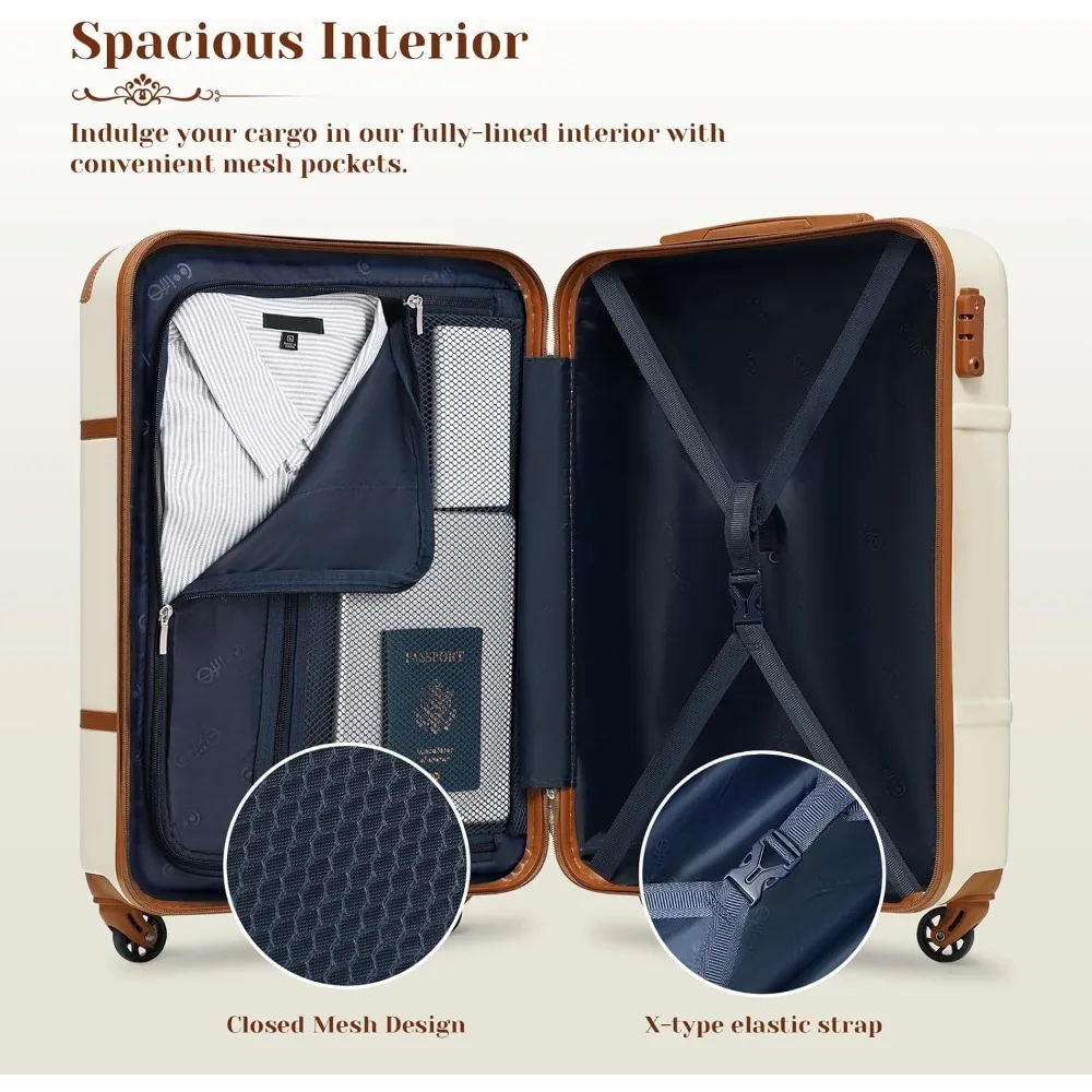 - Blending vintage charm with contemporary functionality, our luggage design encapsulates elegance and craftsmanship from a bygone era. It seamlessly integrates modern spinner wheels for effortless mobility and includes TSA-approved locks for enhanced security.