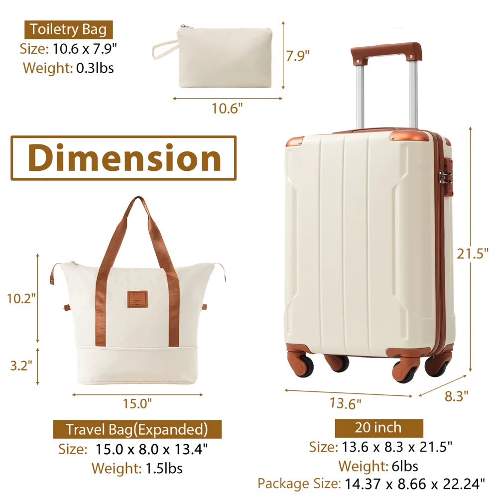 - Luggage set includes a 20-inch suitcase, a travel duffel bag, and a toiletry bag. The duffel bag has trolley sleeve with zippered pocket to pack your travel essentials, you can conveniently attach them to the adjustable suitcase handle to meet your needs.
