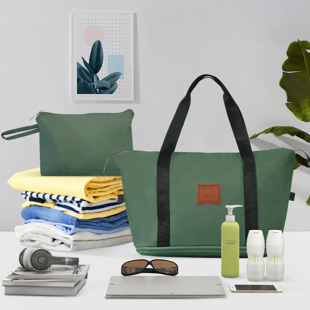- Expandable Weekender Bag: (front shape is trapezoidal): longest length: 21.7", shortest length: 15.7", width: 8.3", height: 13", expanded height: 17.7". The duffel bag has a trolley sleeve with zippered pocket, so you can conveniently hang the bag on the adjustable luggage handle.