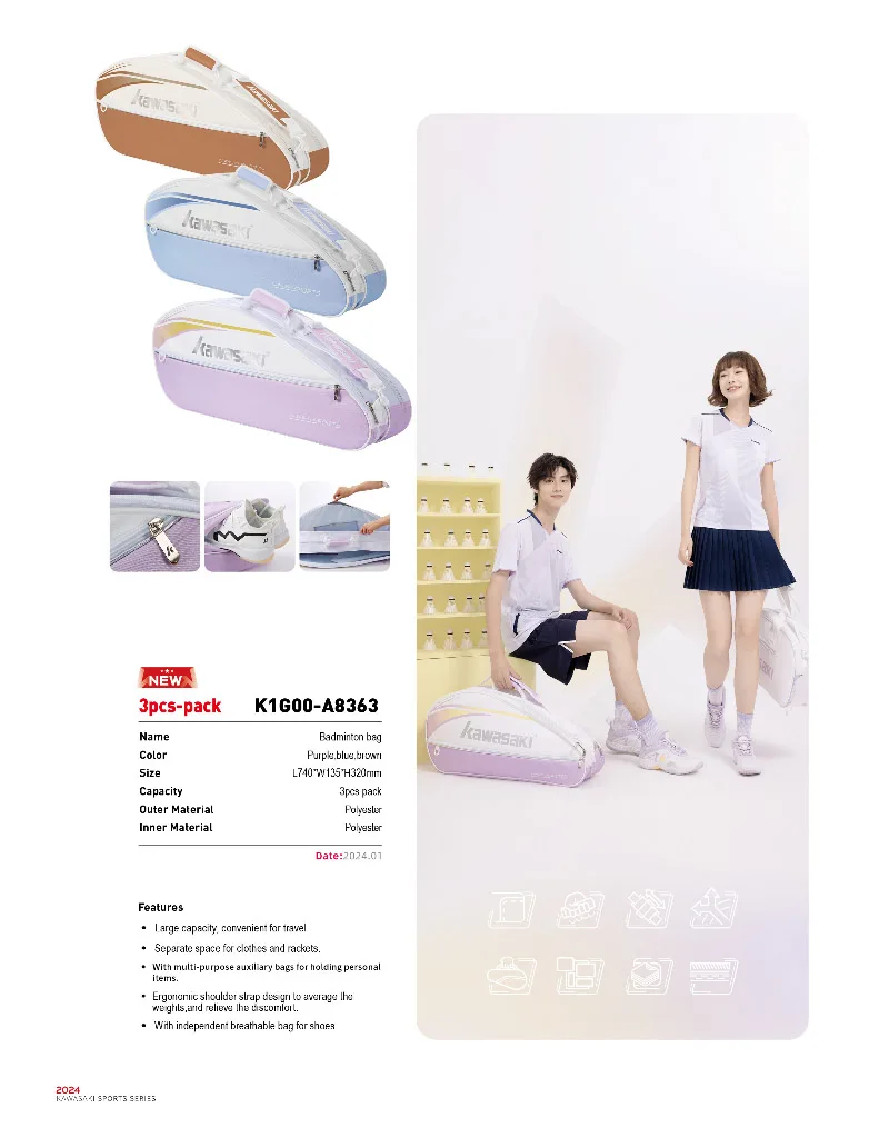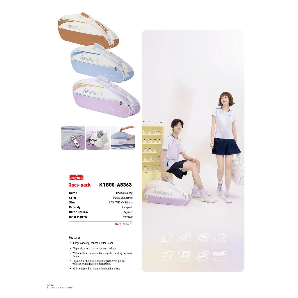 Kawasaki Portable Badminton Racket Bag K1G00-B8363 (Suitable For 6 Rackets) Convenient Carry Sport Gym Bag