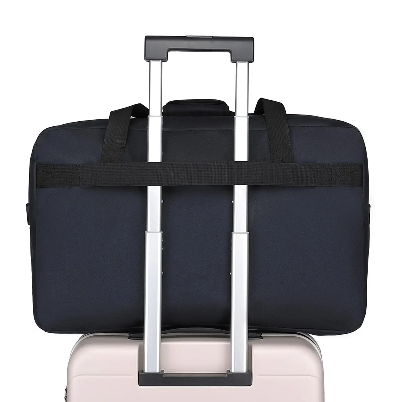 The gym bag features two handles on the top with a velcro strap for carrying in your hand. If you prefer to carry your bag on your shoulder, it includes a length adjustable shoulder strap for comfort. Or if you travel with a larger cabin suitcase or hold luggage, it features a special attachment strap on the back so you can mount the bag over your extendable trolley handle.