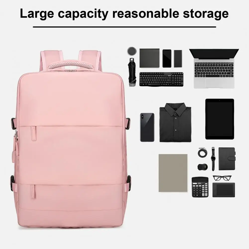 Featuring a Large Capacity & Multi-Pocket Design, this backpack is equipped with padded compartments for a 16-inch laptop and a 12.9-inch for iPad. The main compartment includes a wet layer design for storing toiletries and wet items, along with a multifunctional storage bag for organizing essentials like sunglasses, tissues, keys, wallet, magazines, book, notes, pens, and snacks.