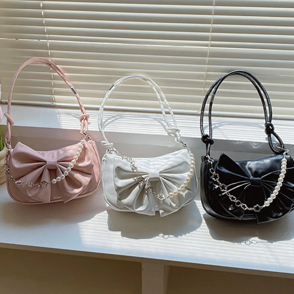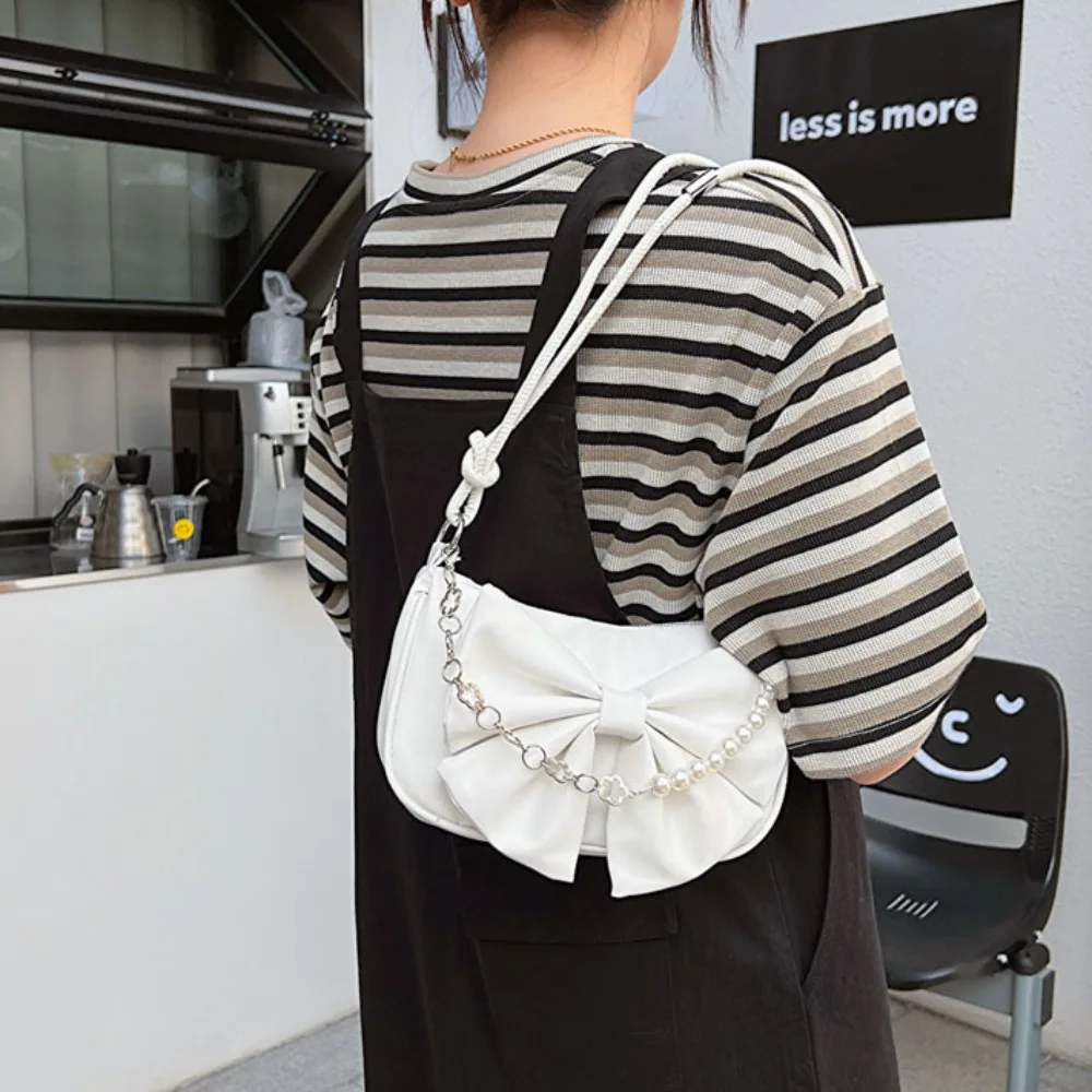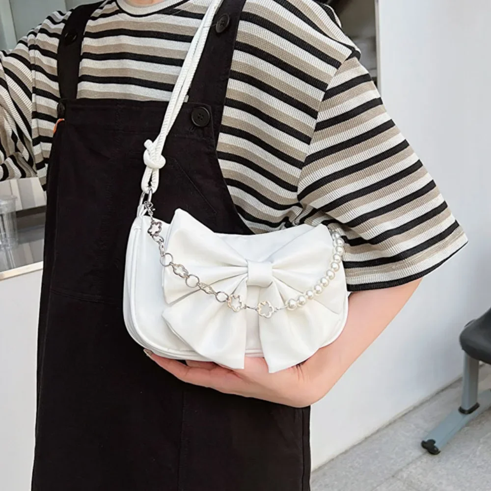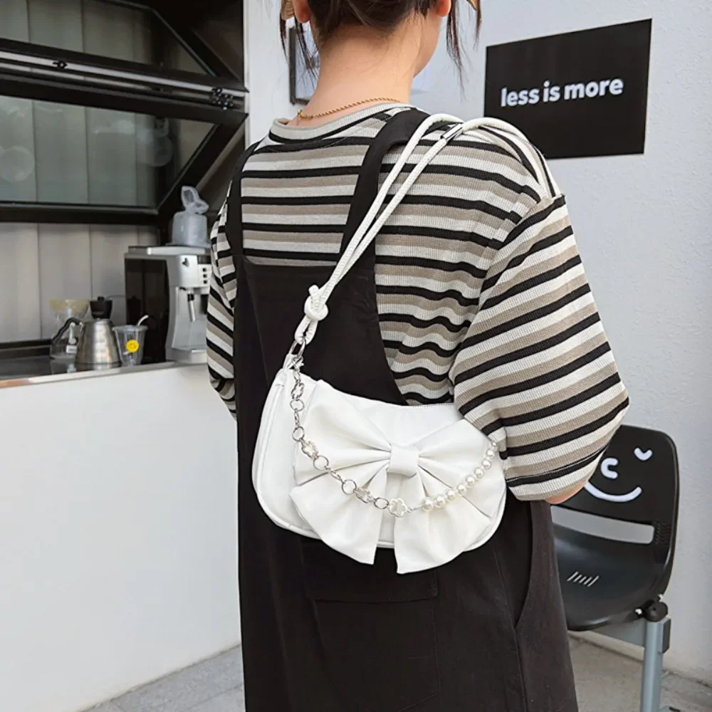 Trendy Pearl Bow Shoulder Bag Underarm Bag Daily Commuting Bag Casual Handbag Solid Business Women's Bag