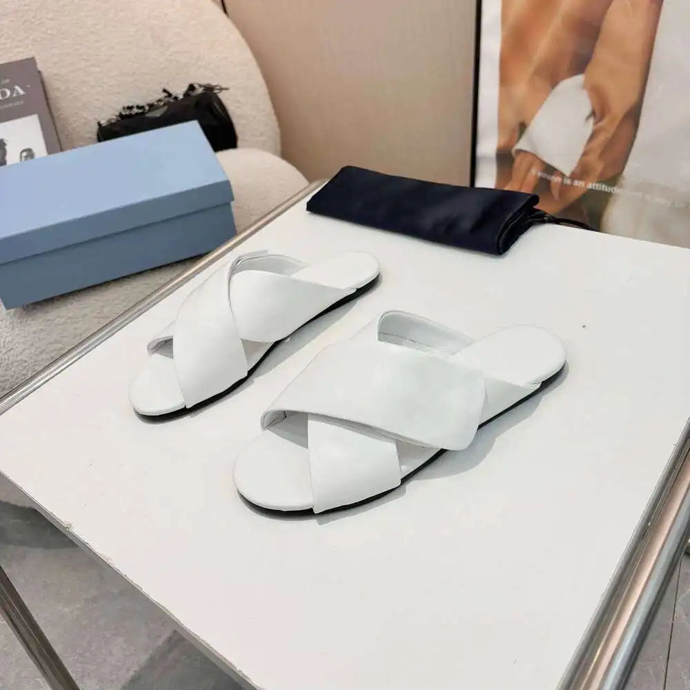 Triangle P New Women Genuine Leather Slippers Summer Beach Slides Leisure Flats Solid Designer Shoes Zapatillas De Mujer Aff