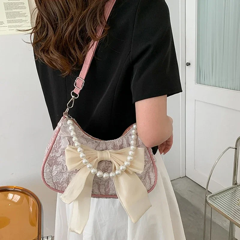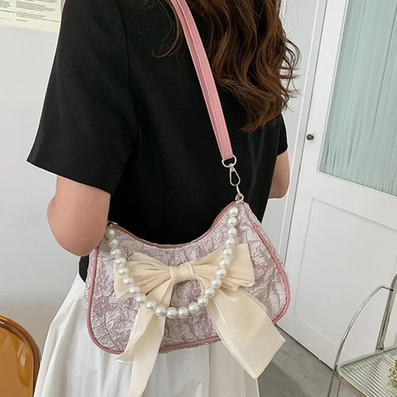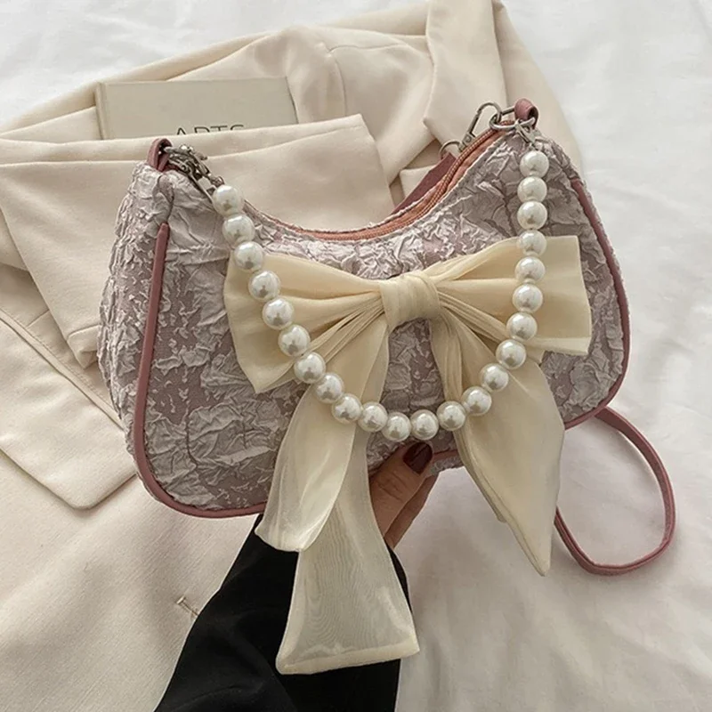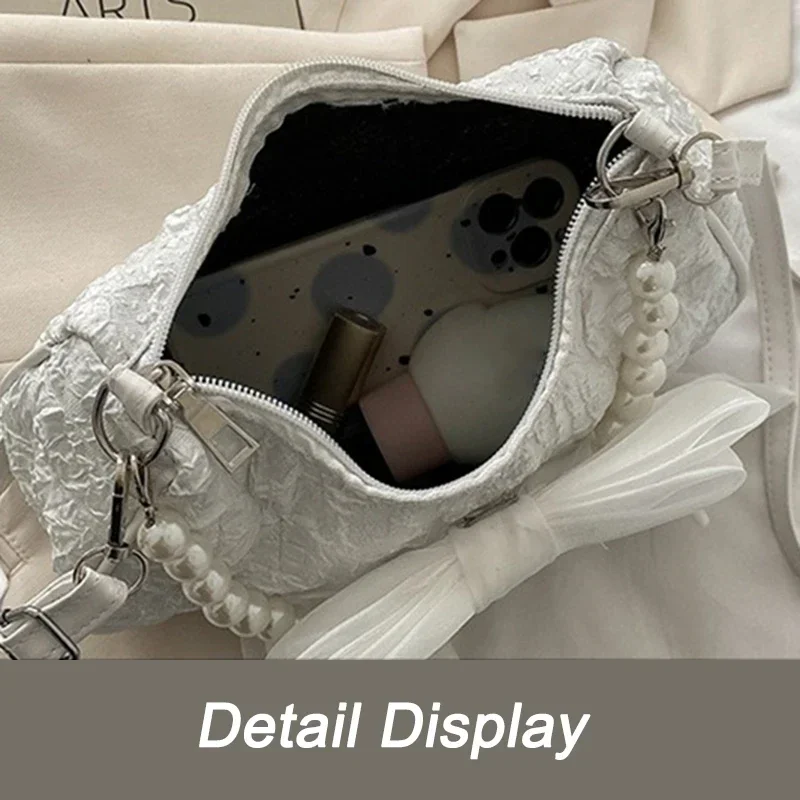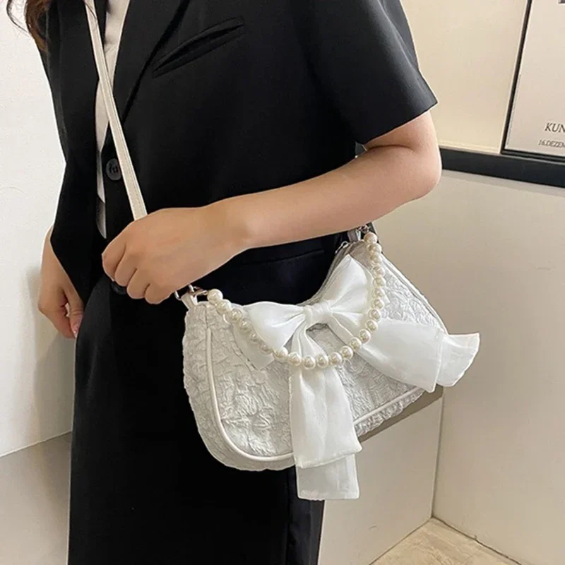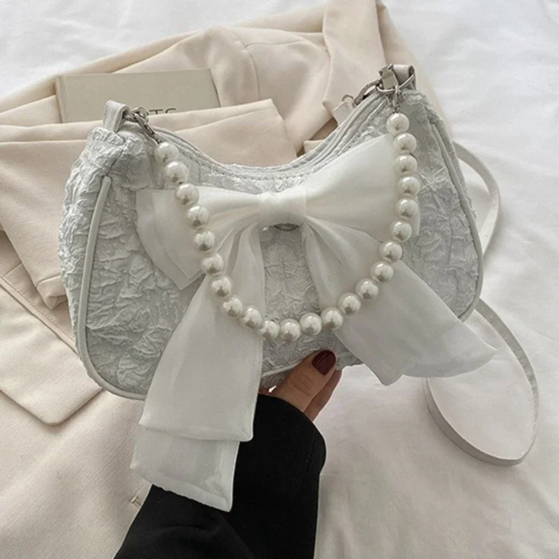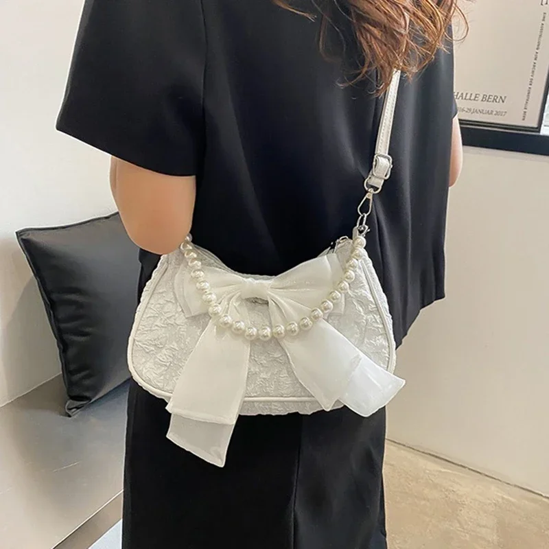 White Pleated Pearl Female Bag Vintage Luxury Designer Handbag Cute Bow Shoulder Bag Fashion Y2K Vintage Women's Purse Versatile