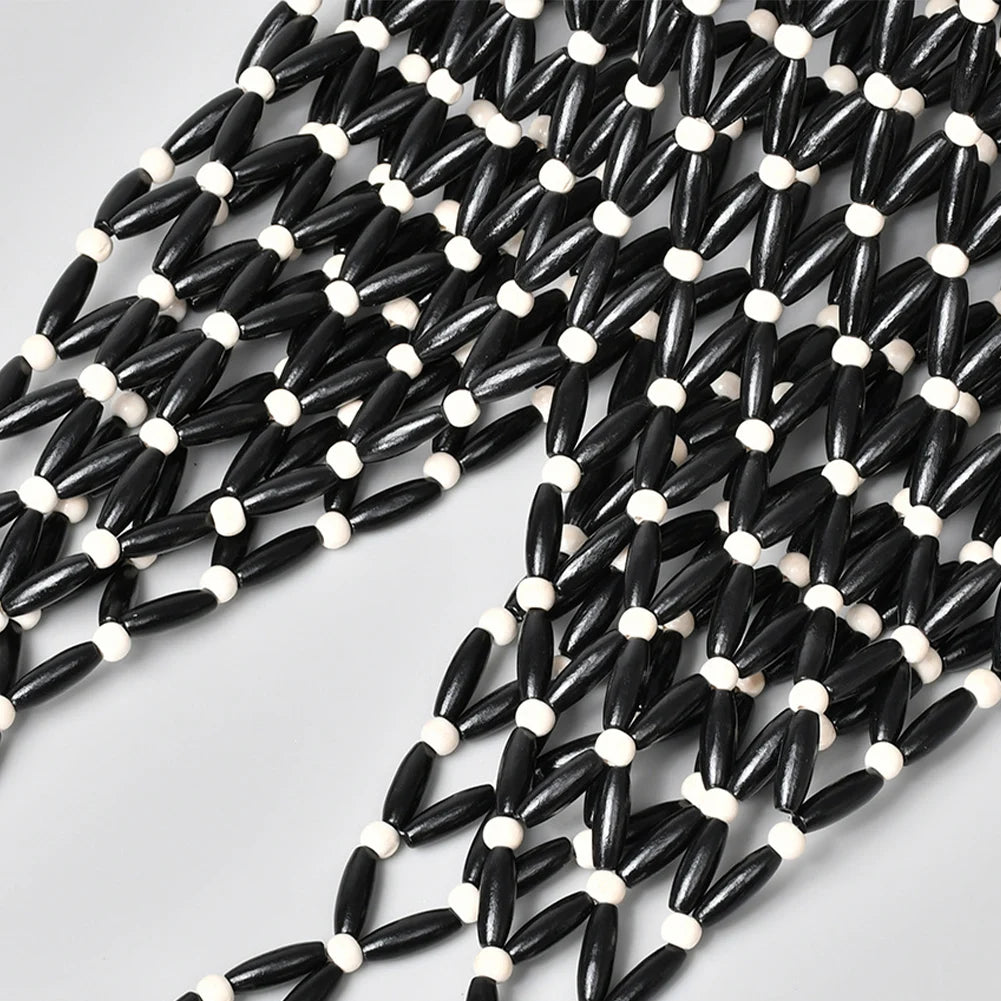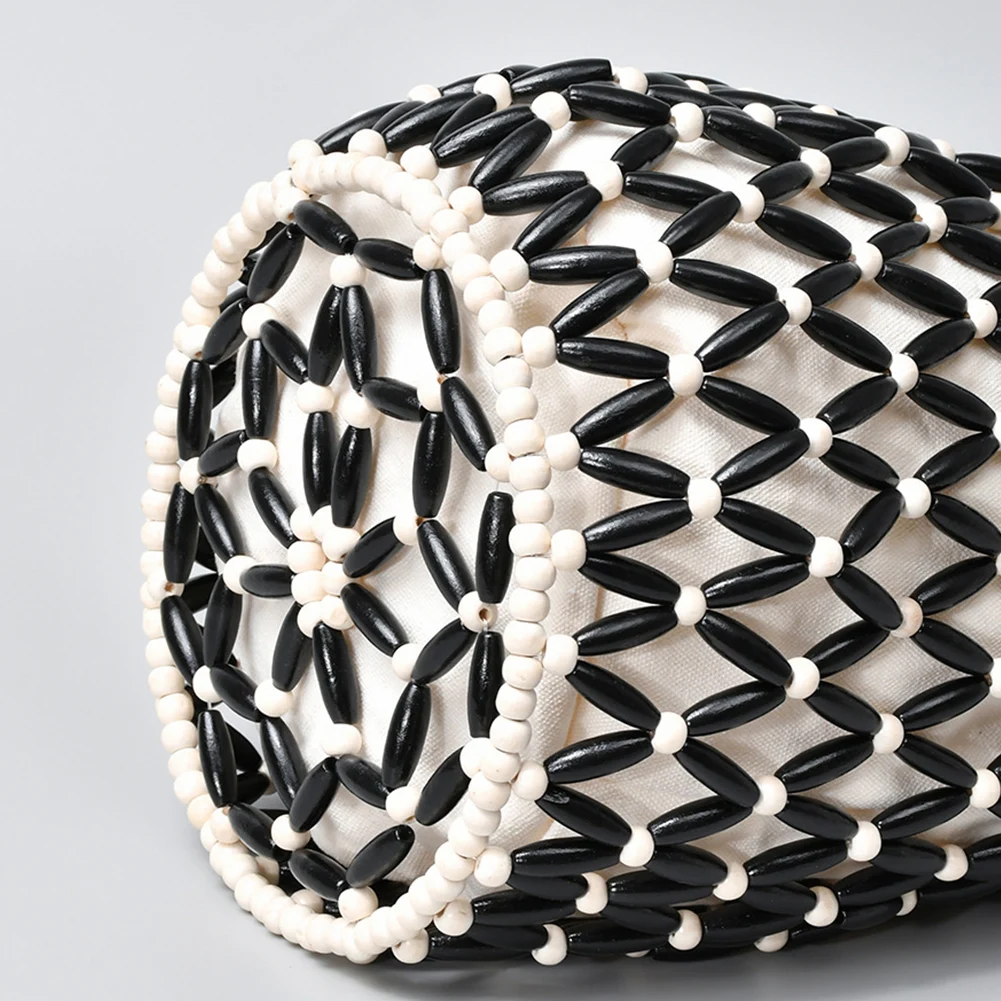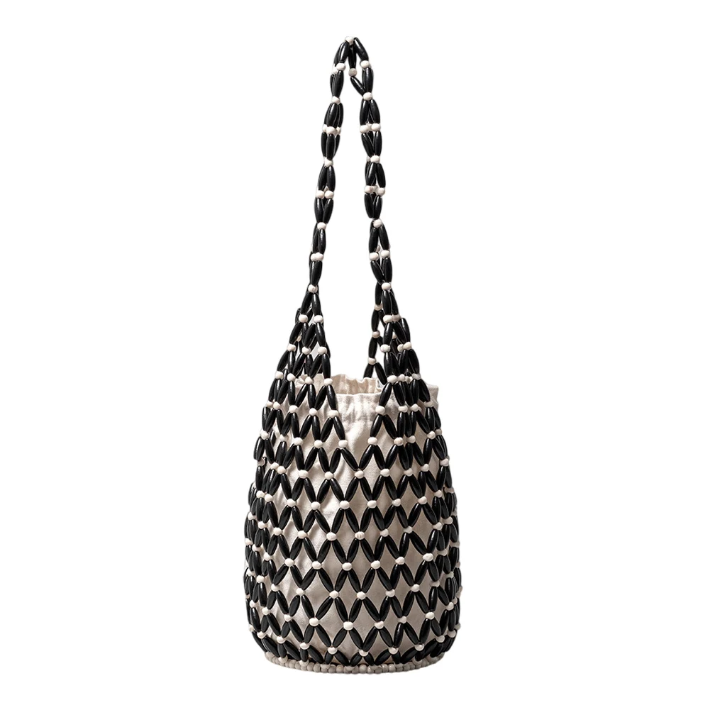 Women Beaded Bag Hollow-out Wooden Bead Tote Bucket Fashion Shoulder Bag Female Beach Handbag Storage Bag for Travels Shopping