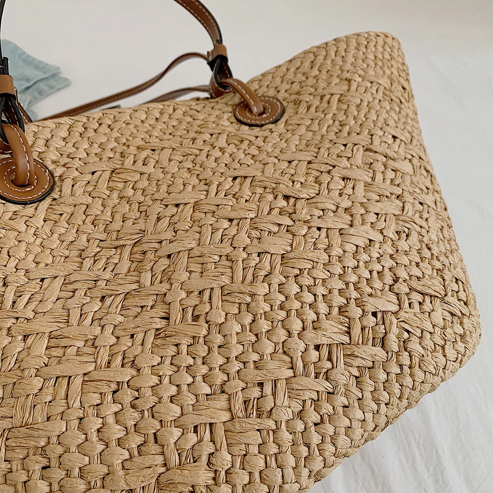1. Paper Rope Material: Crafted from sturdy paper rope, this women woven tote bag is not only but also easy to maintain, ensuring longevity and ease of care for your everyday or vacation needs. Specification: Origin: Mainland China Shape: Bucket Main Material: Paper Rope Size: 280.00x270.00x180.00mm/11.02x10.63x7.09inch Lining Material: None Place Of Origin: HE BEI Province