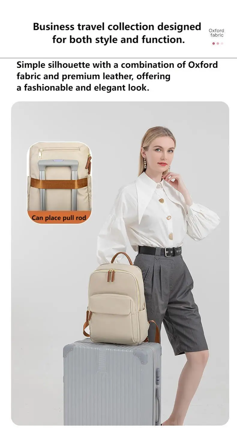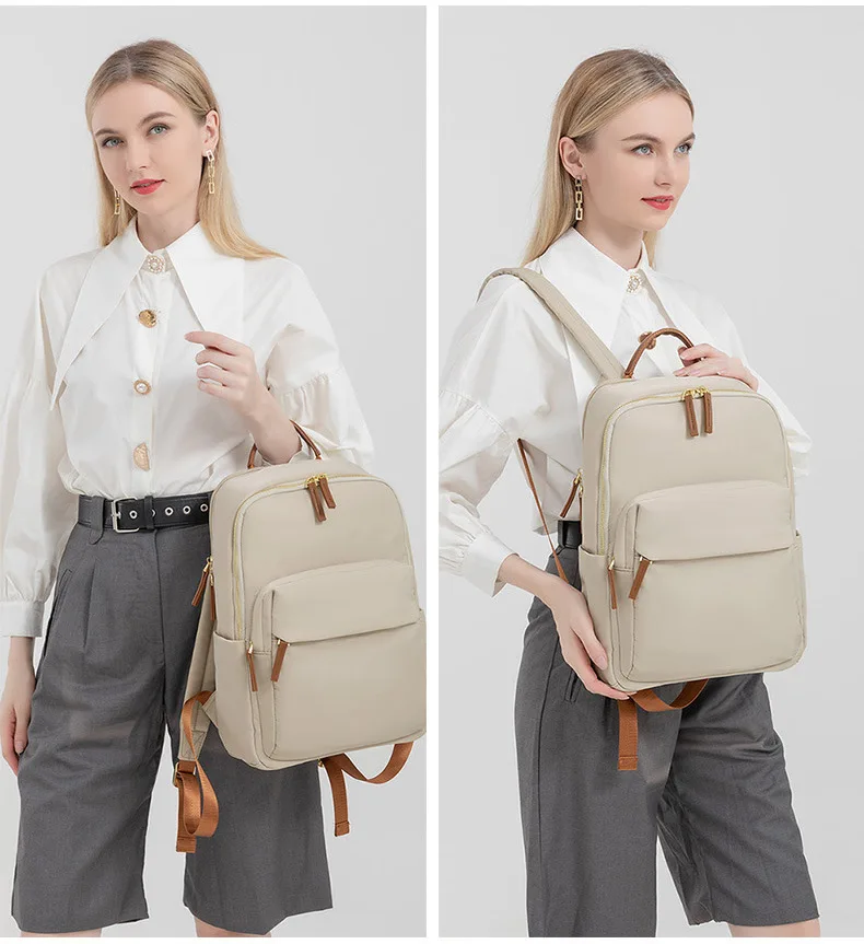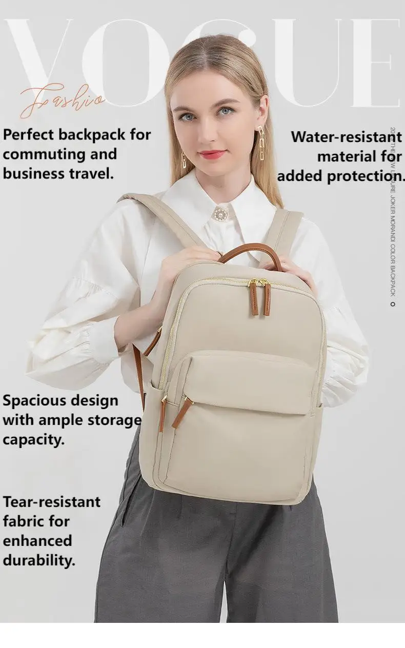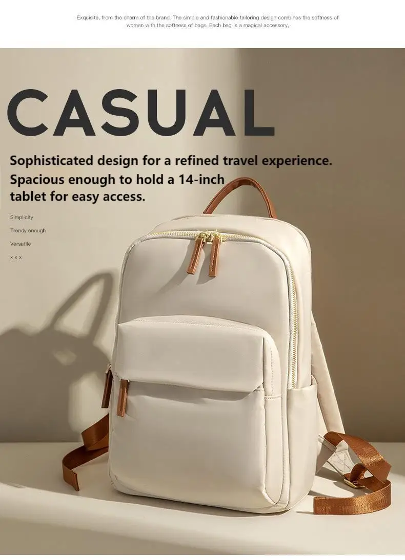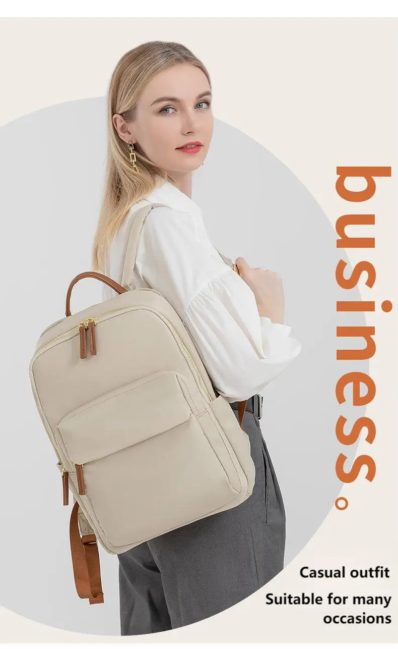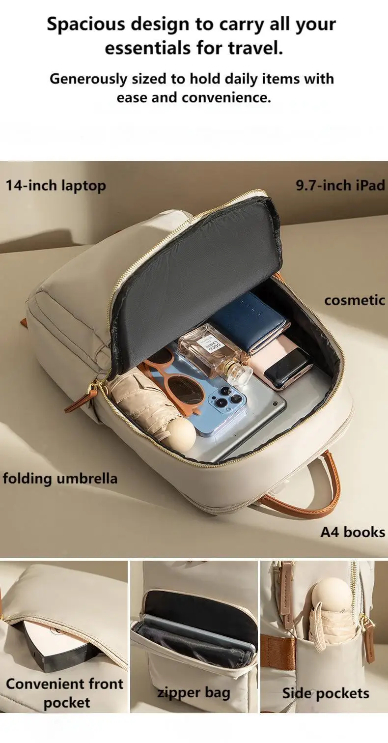 This womens laptop backpack combines stylish Korean design with practicality, ideal for professional women and students. Made of durable material, its large capacity and multi-compartment design easily store 14-inch laptops and daily items, keeping everything organized. Adjustable shoulder straps fit different body types, and secure zipper closure protects your belongings. Perfect for commuting, school or travel, it’s versatile enough for any occasion.